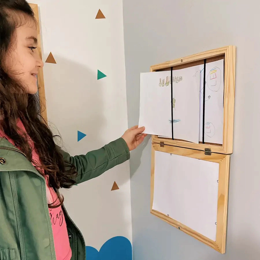 Apresente os preciosos desenhos do seu filho com o nosso Quadro Guarda Desenho, uma solução inteligente que une funcionalidade e decoração. Ideal para guardar e exibir até 70 folhas no tamanho A4 ou até 60 folhas no A3, este quadro traz mais afeto e carinho ao seu lar, celebrando a criatividade infantil.