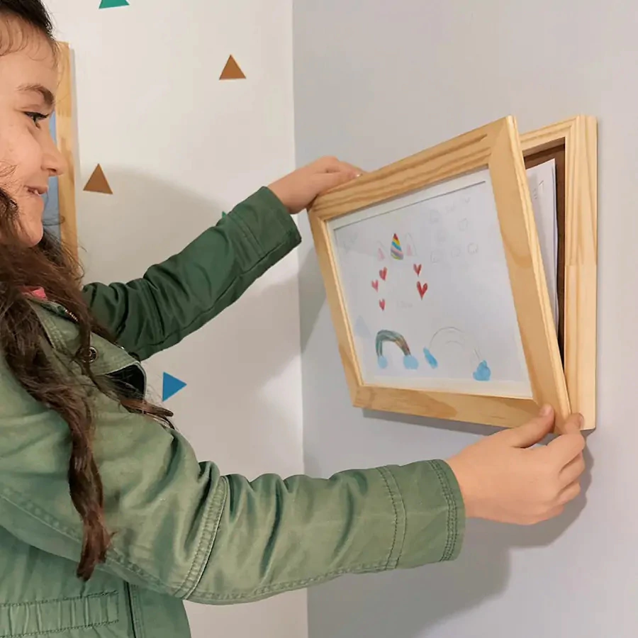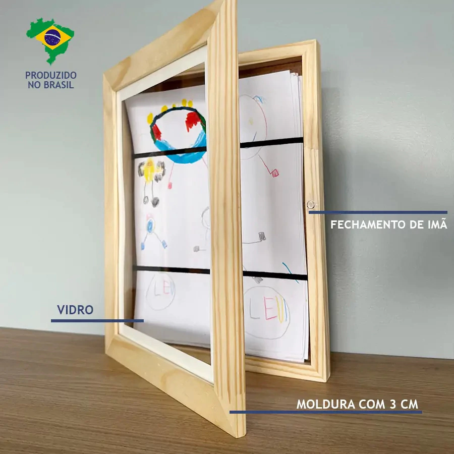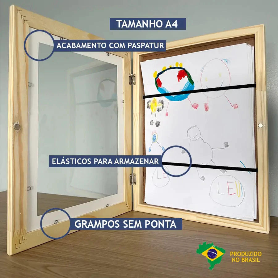 Apresente os preciosos desenhos do seu filho com o nosso Quadro Guarda Desenho, uma solução inteligente que une funcionalidade e decoração. Ideal para guardar e exibir até 70 folhas no tamanho A4 ou até 60 folhas no A3, este quadro traz mais afeto e carinho ao seu lar, celebrando a criatividade infantil.